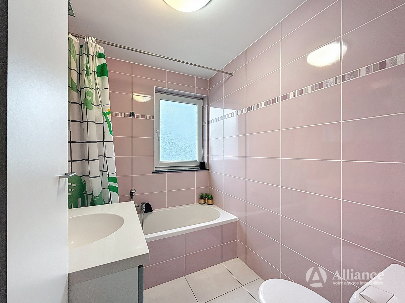 Hall d'entrée, living (25m2), cuisine équipée (7,2m2), buanderie (3m2), hall de nuit (4m2), wc séparé, salle de bain (douche dans la baignoire) (4,5m2), chambre 1 (9,5m2), chambre 2 (9,4m2), balcon (5,5m2).