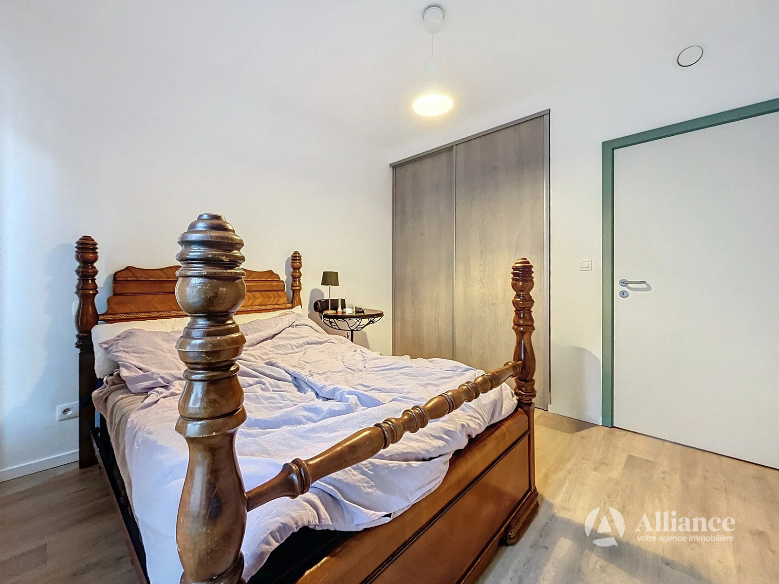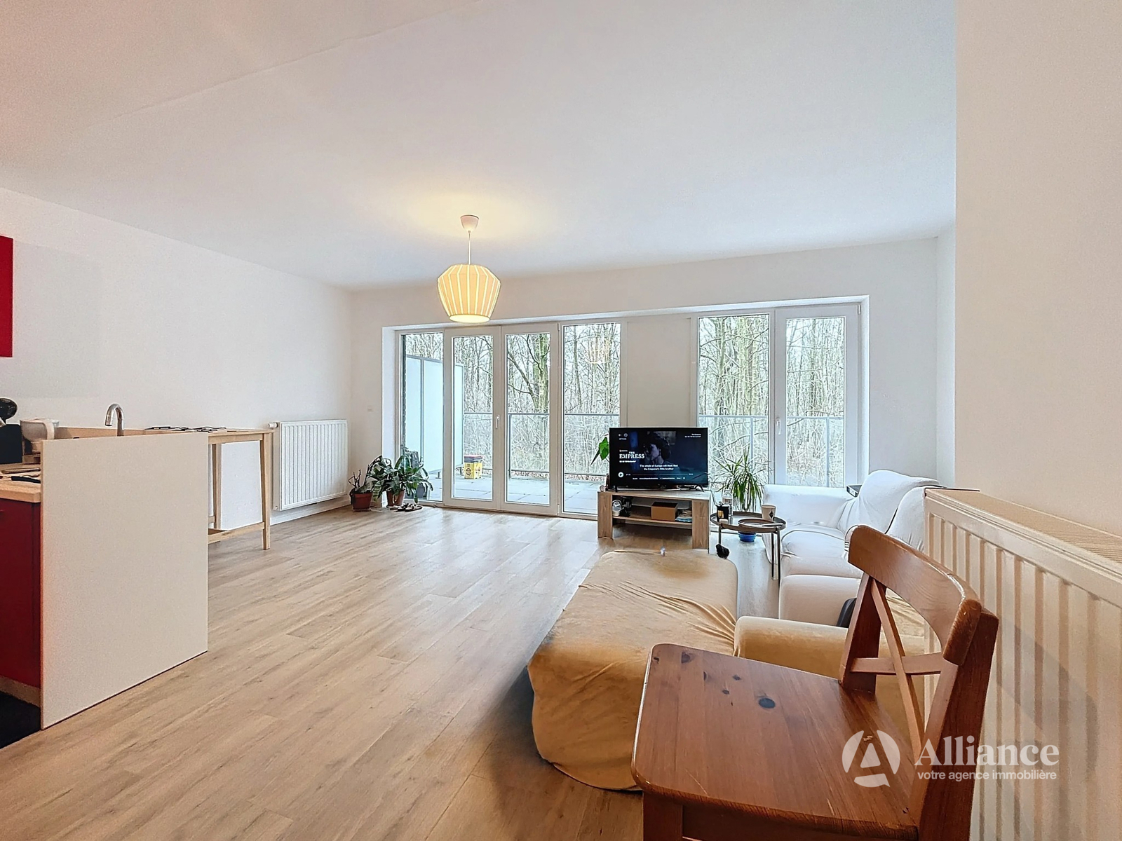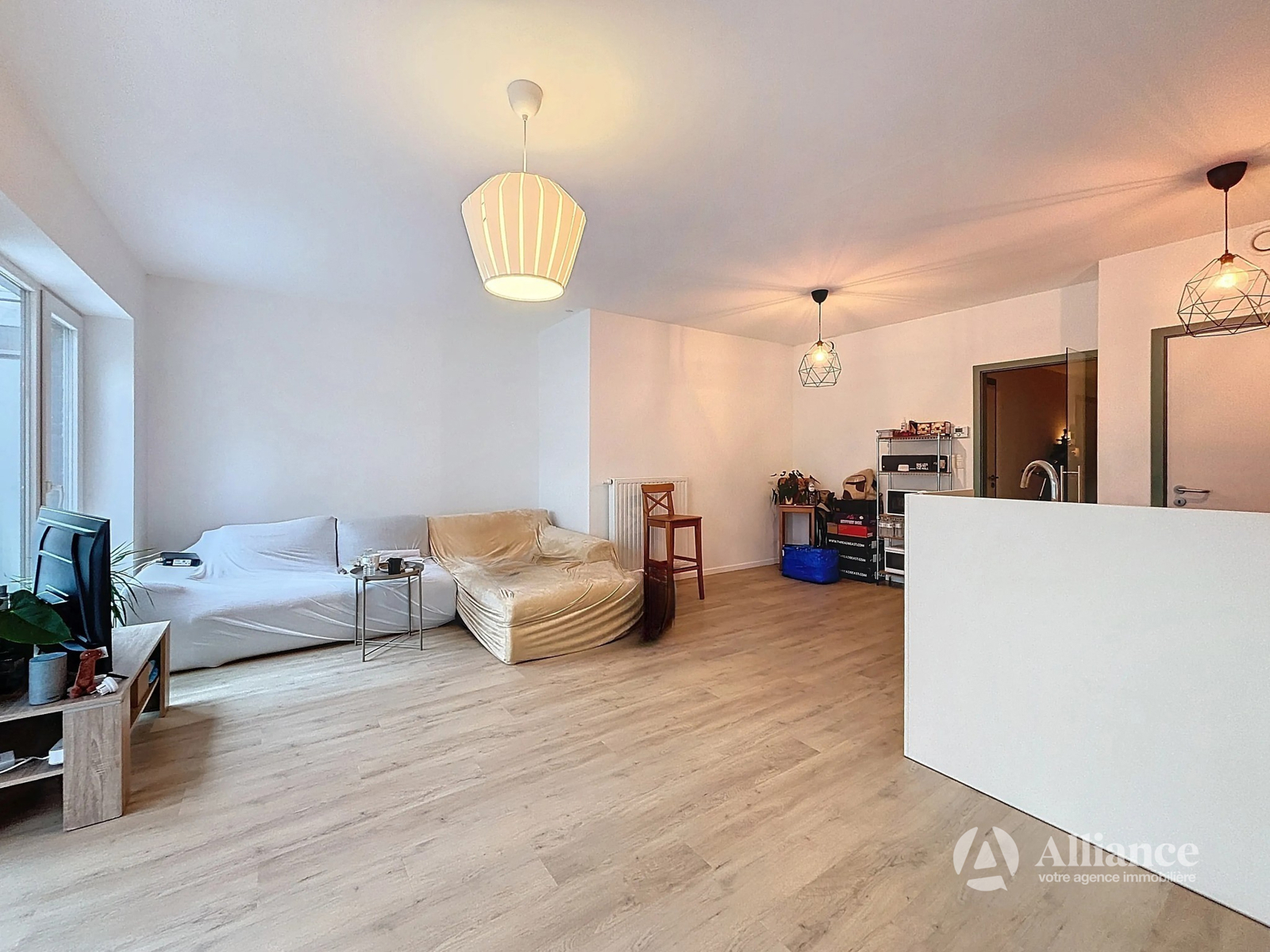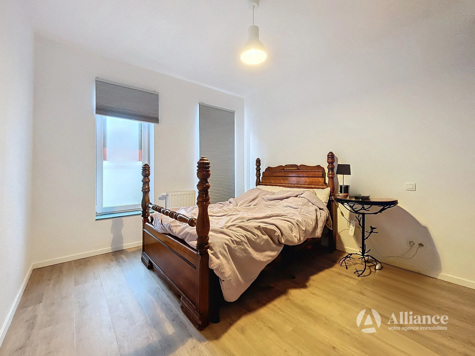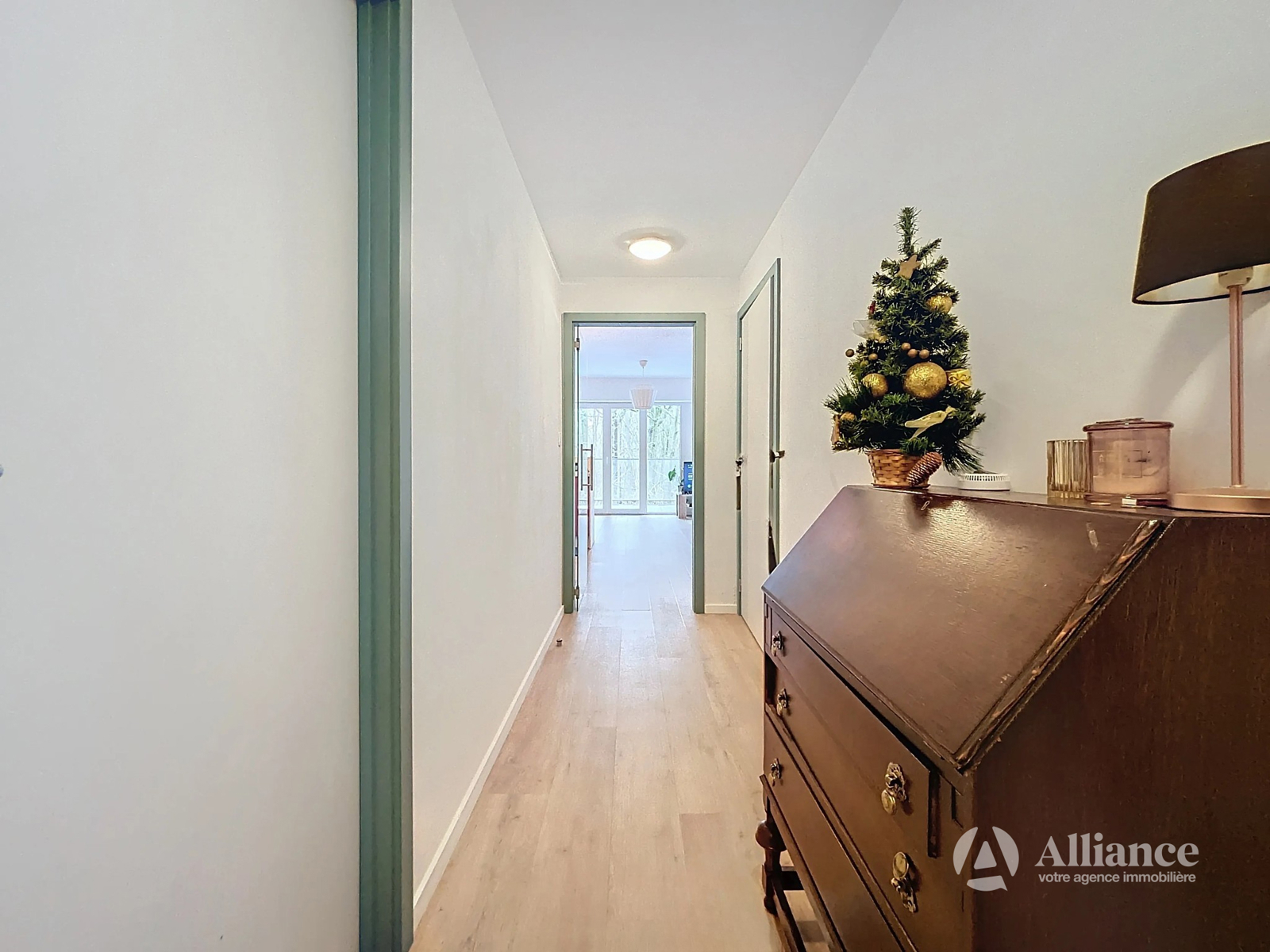 Hall d'entrée, wc séparé, spacieux et lumineux living avec cuisine ouverte entièrement équipée (frigo/congélateur, four, taque, hotte, lave vaisselle), buanderie, terrasse de 16m2 idéalement orientée, chambre avec dressing, salle de bain (baignoire, double lavabo).