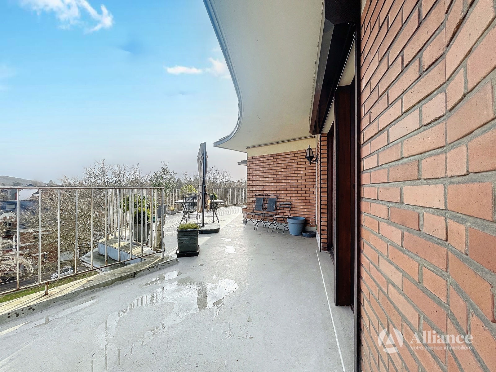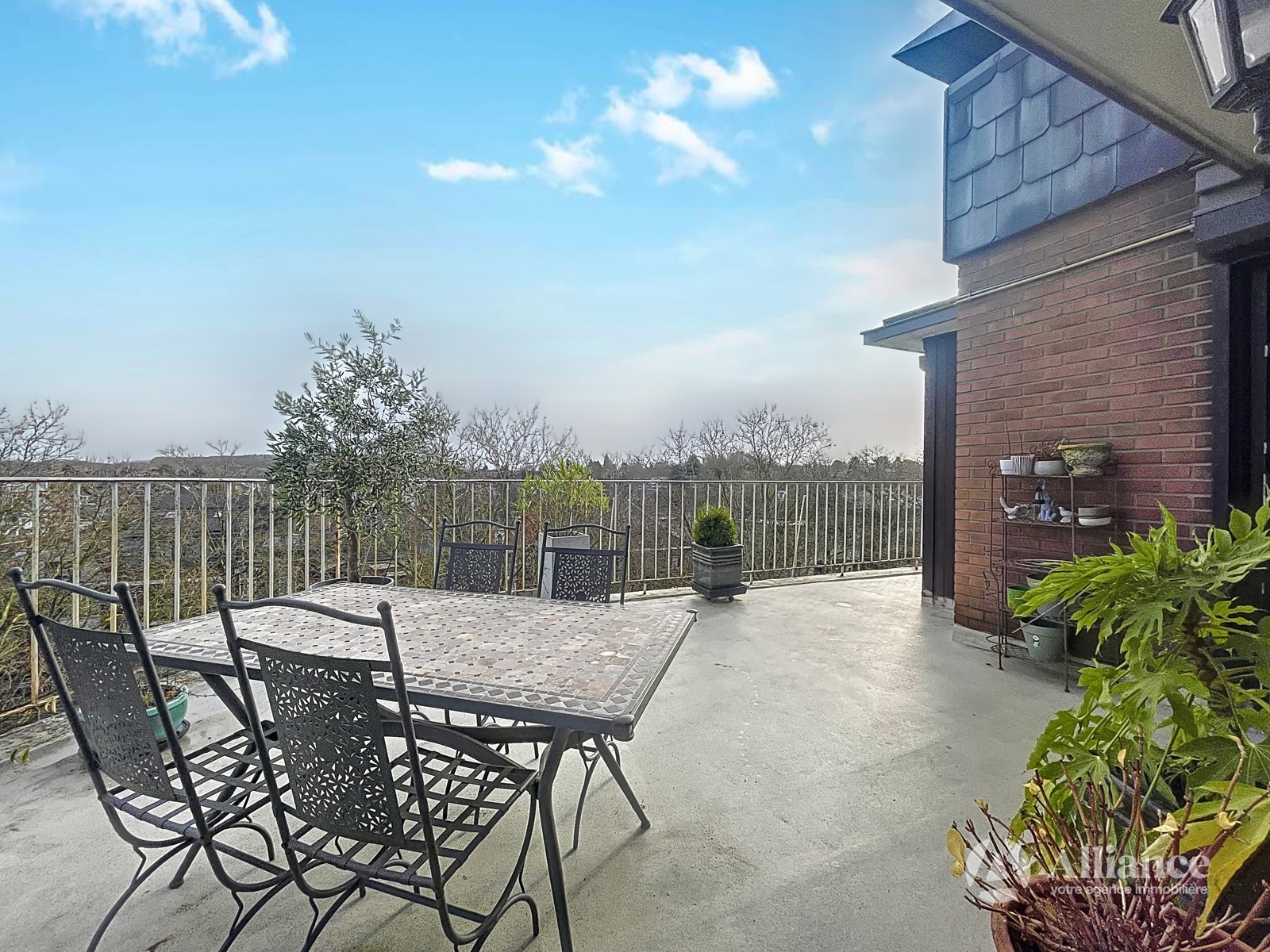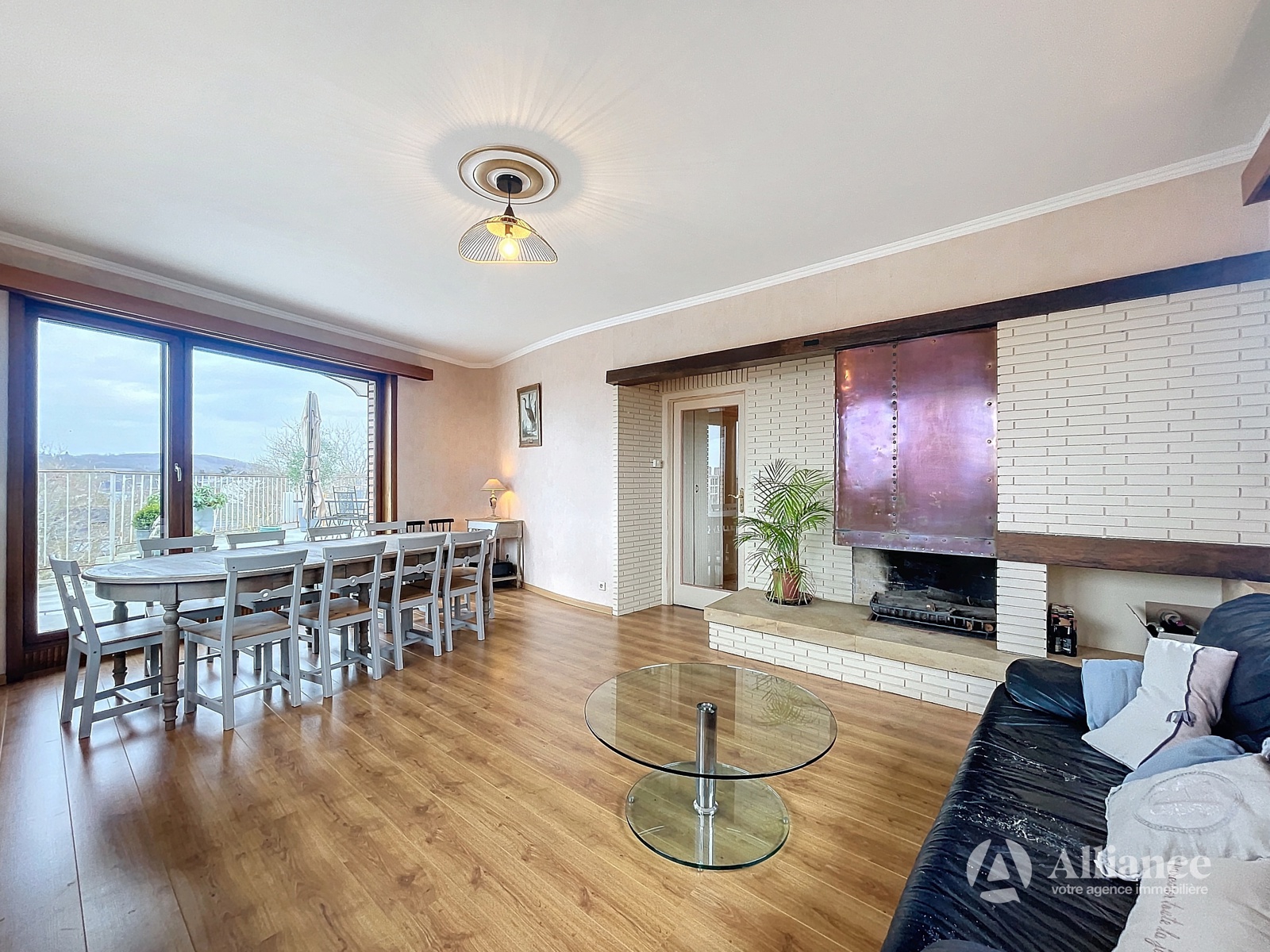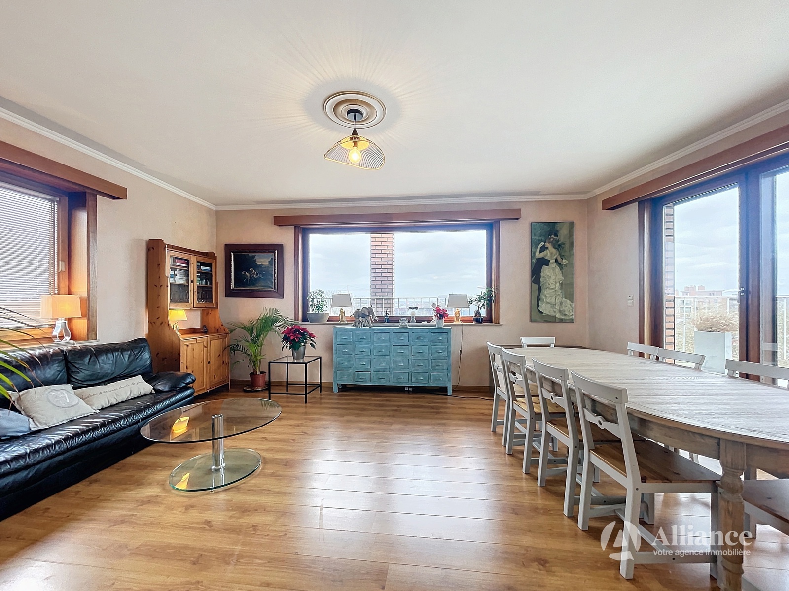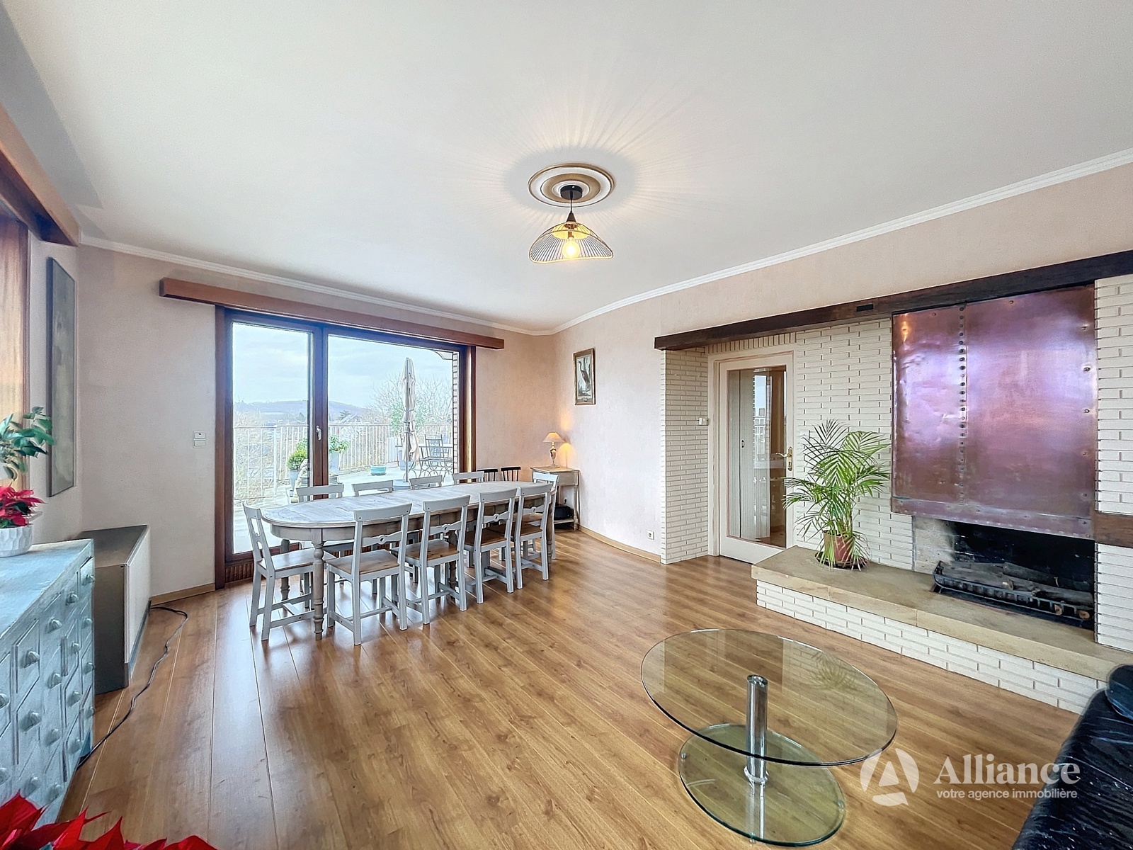 Espace de vie lumineux avec baies vitrées offrant une vue panoramique sur Mons.