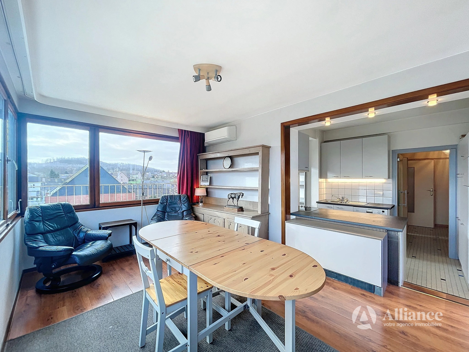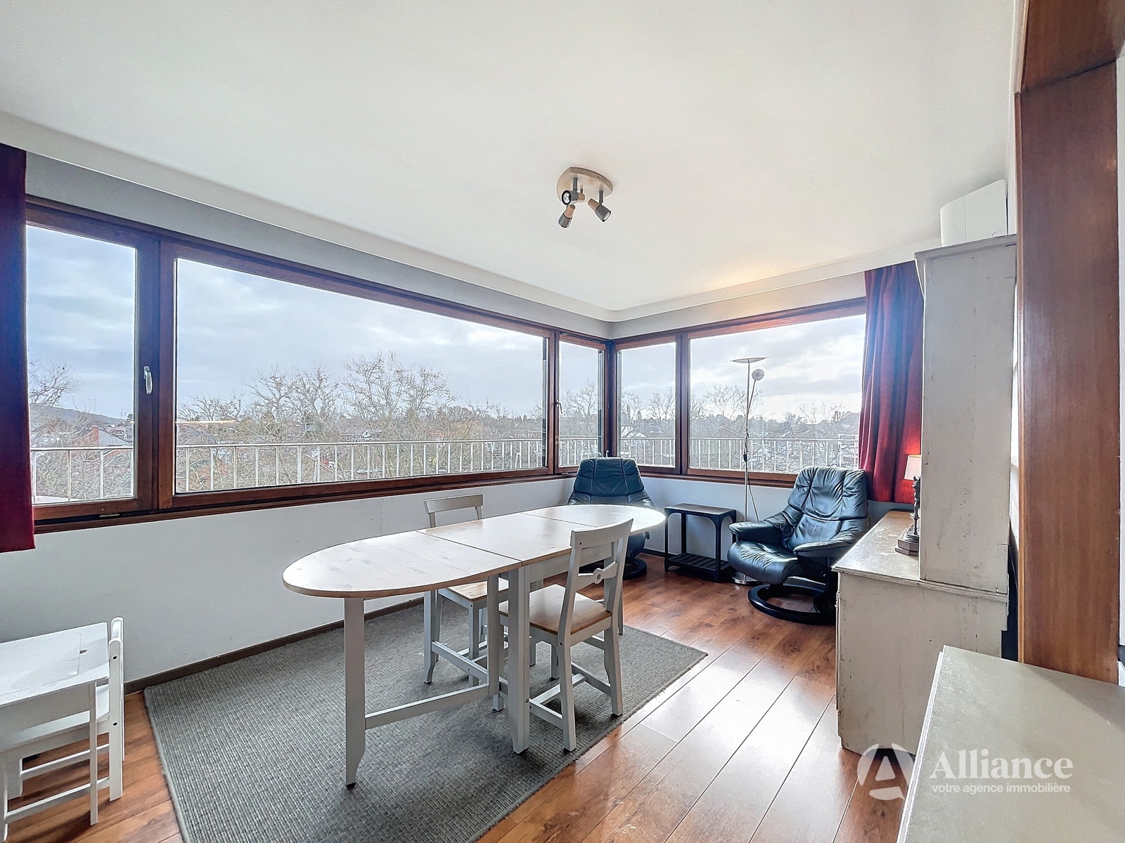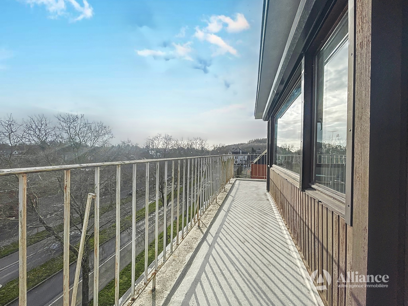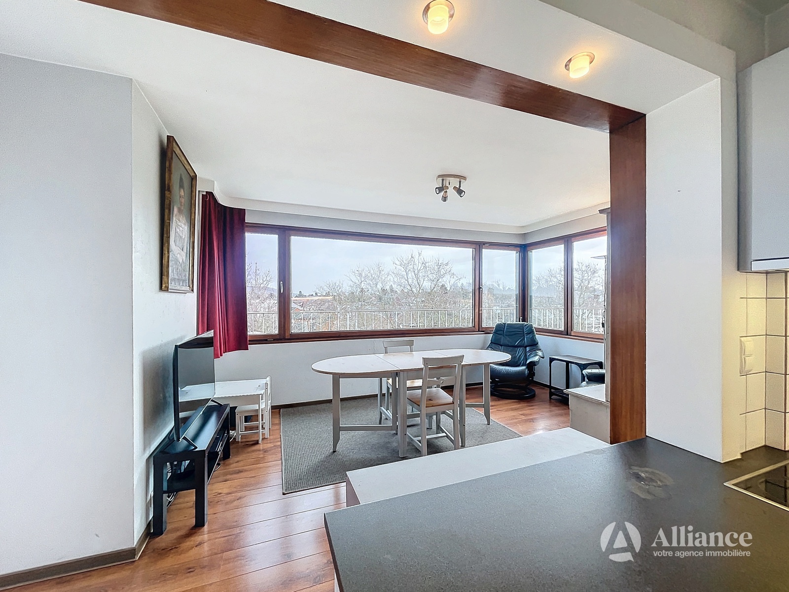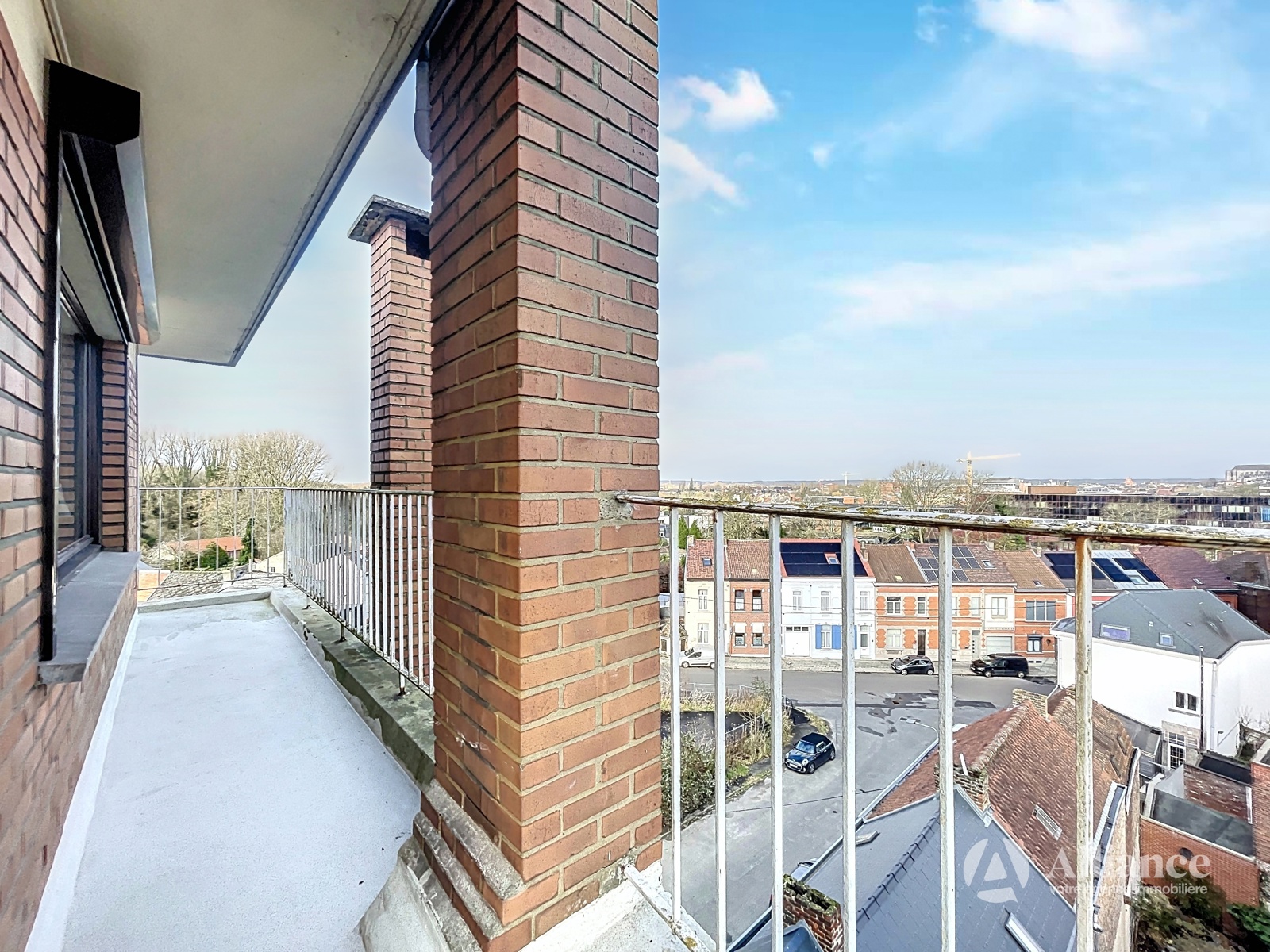 Espace de vie lumineux avec baies vitrées offrant une vue panoramique sur Mons.