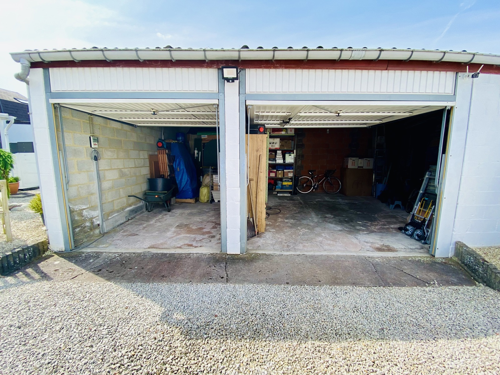 Extérieur: Deux garages dont un peut abriter un grand véhicule, le second pour un voiture et espace de rangements.